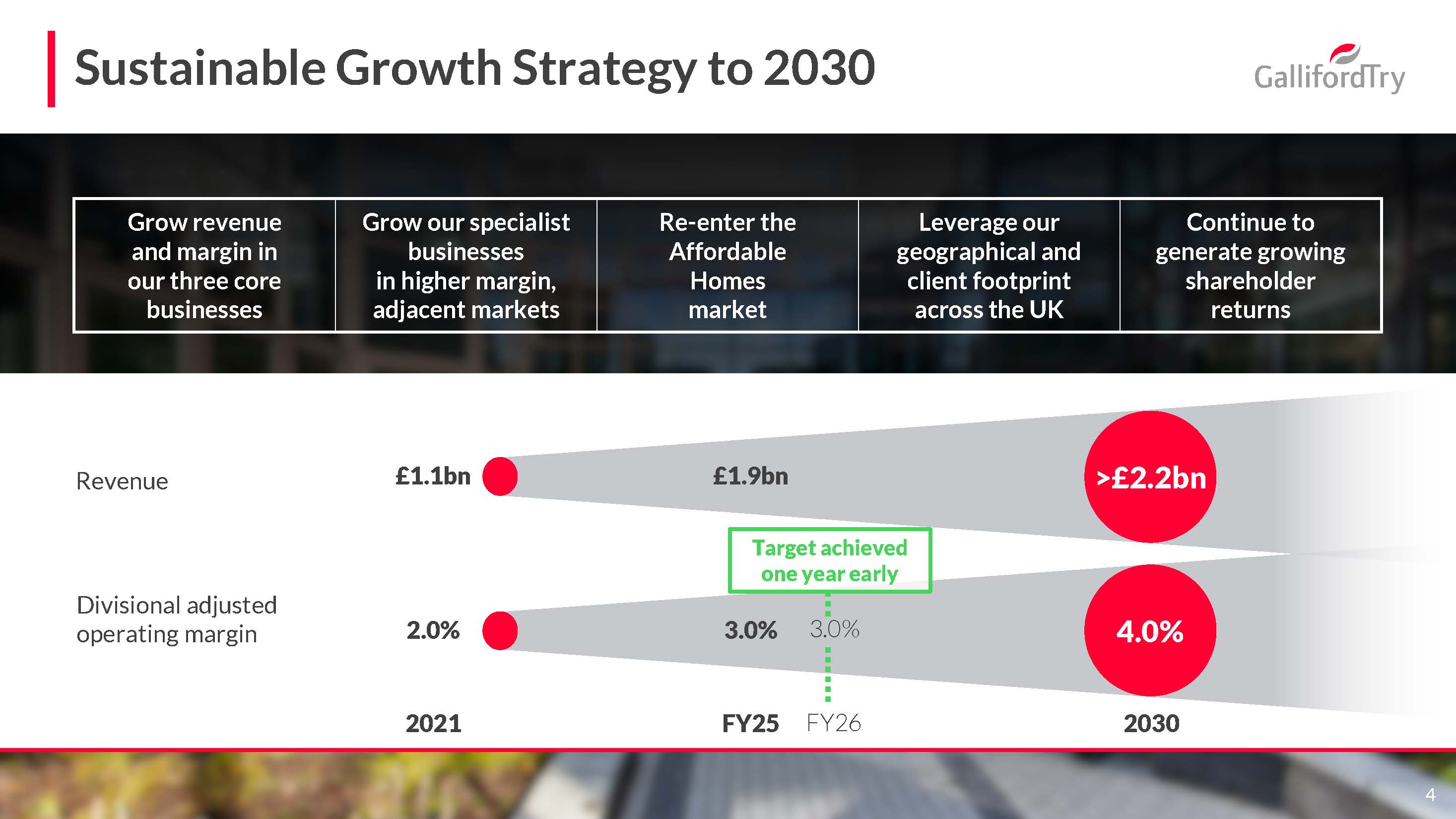 In May 2024, Galliford Try announced its 2030 strategy, targeting in excess of £2.2bn in revenue and a divisional operating margin of 4.0%, having accelerated its strategy to 2026 ahead of programme and with the margin goal rising from 3.0% to 4.0%.