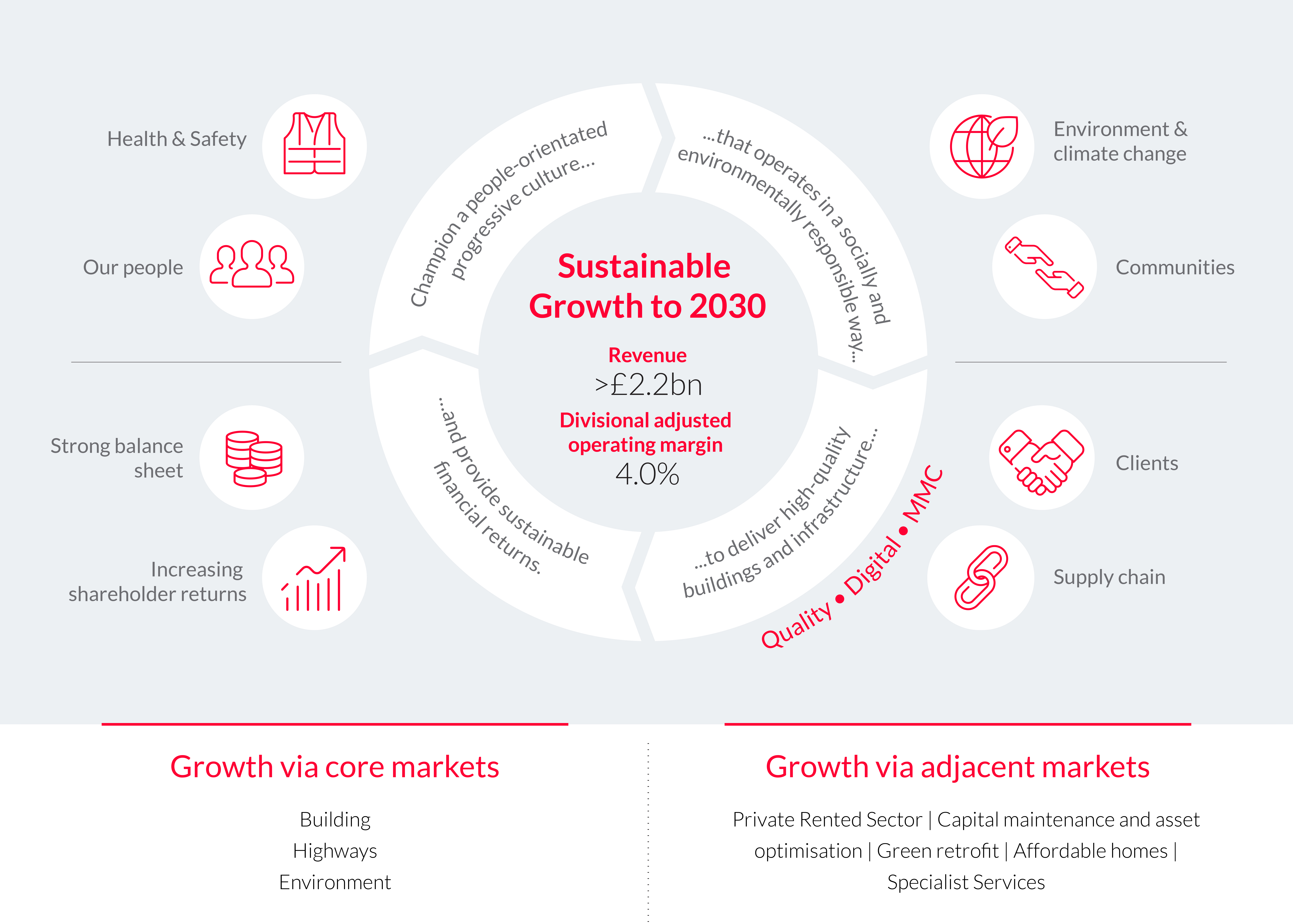 Delivering lower carbon, superior buildings and infrastructure with a better social footprint for clients in our chosen markets through a focus on innovation, digitalisation and quality. |